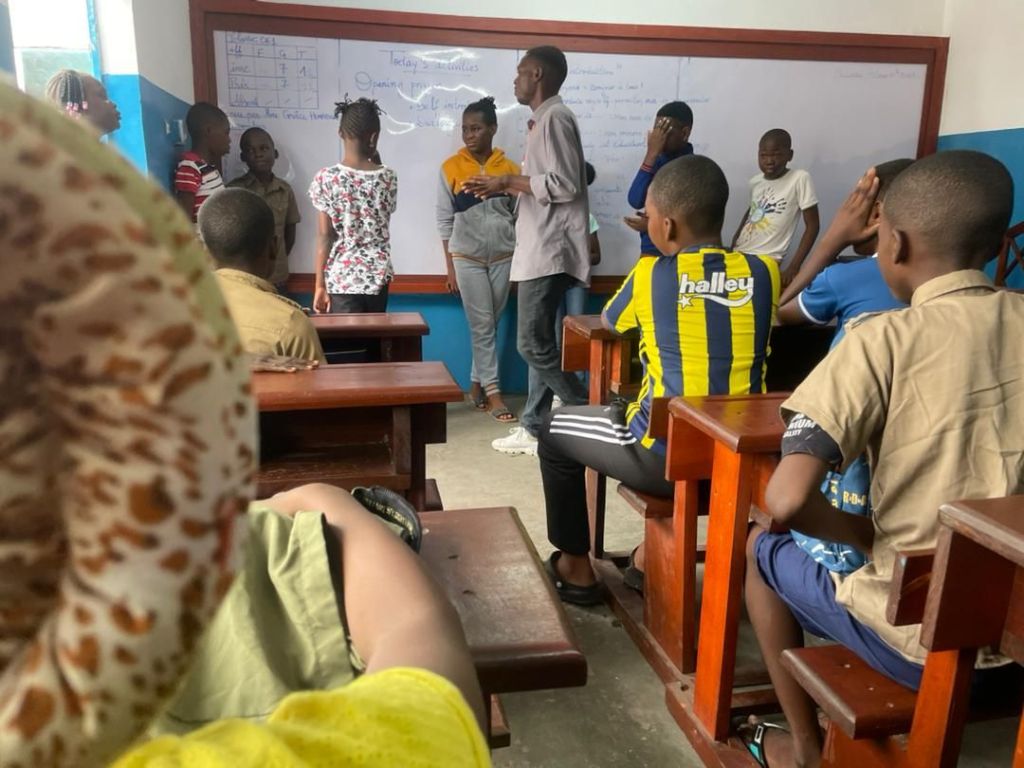 Dès les premières minutes, la classe s’est transformée en une scène vivante et animée. Les enfants, divisés en trois groupes, avaient chacun un rôle bien précis. D’un côté, les “chanteurs” entonnaient la chanson “Nsakamot” en deux temps — “nsaka-nsaka-mot” —, donnant le ton de cette rencontre rythmée. En face, les “batteurs” accompagnaient en cadence, frappant sur des instruments ou des objets improvisés, toujours en phase avec les voix. Et tout autour, les “danseurs” faisaient vibrer la salle avec des mouvements joyeux et synchronisés.
